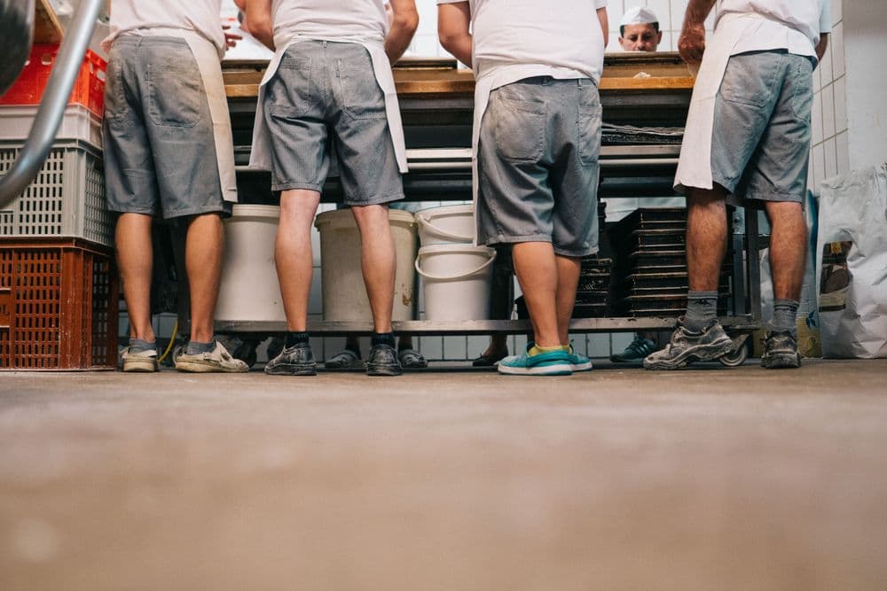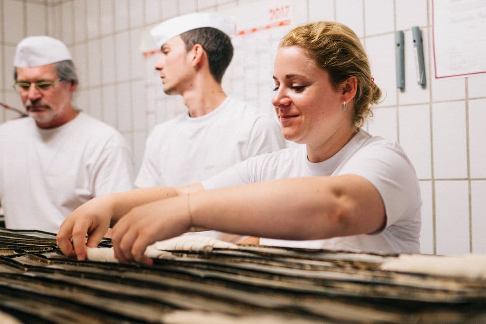 Jeder Zentimeter der engen Bäckerei-Räumlichkeiten wird zweckdienlich ausgefüllt. Die Platznot fängt schon beim Mehllieferanten an: Der spezielle Lieferwagen kommt nur mit Zentimeterarbeit zum Ziel. In den Arbeitsräumen findet zeitgleich ein genau getaktetes Ballett statt. Bäcker und Konditoren erzeugen hier ein Sortiment von mehr als 150 Produkten. Die langgedienten Bäckermeister und Gesellen wissen genau, wer wann einen Schritt zur Seite tun muss. Und sie reagieren rasch, wenn sich das kurze Zeitfenster öffnet um die eigene Ware im Ofen unterzubringen.